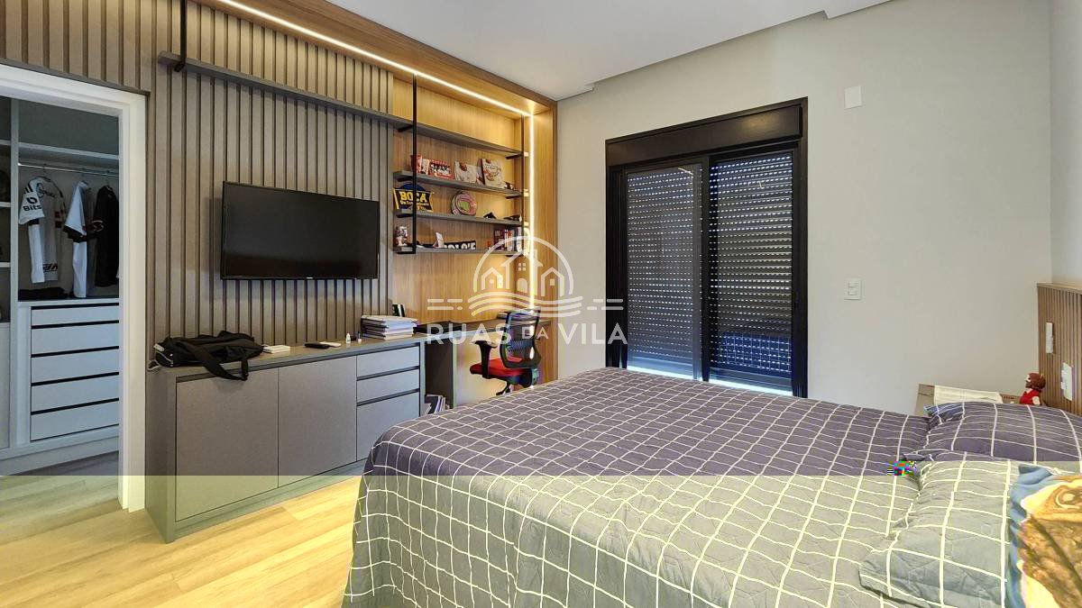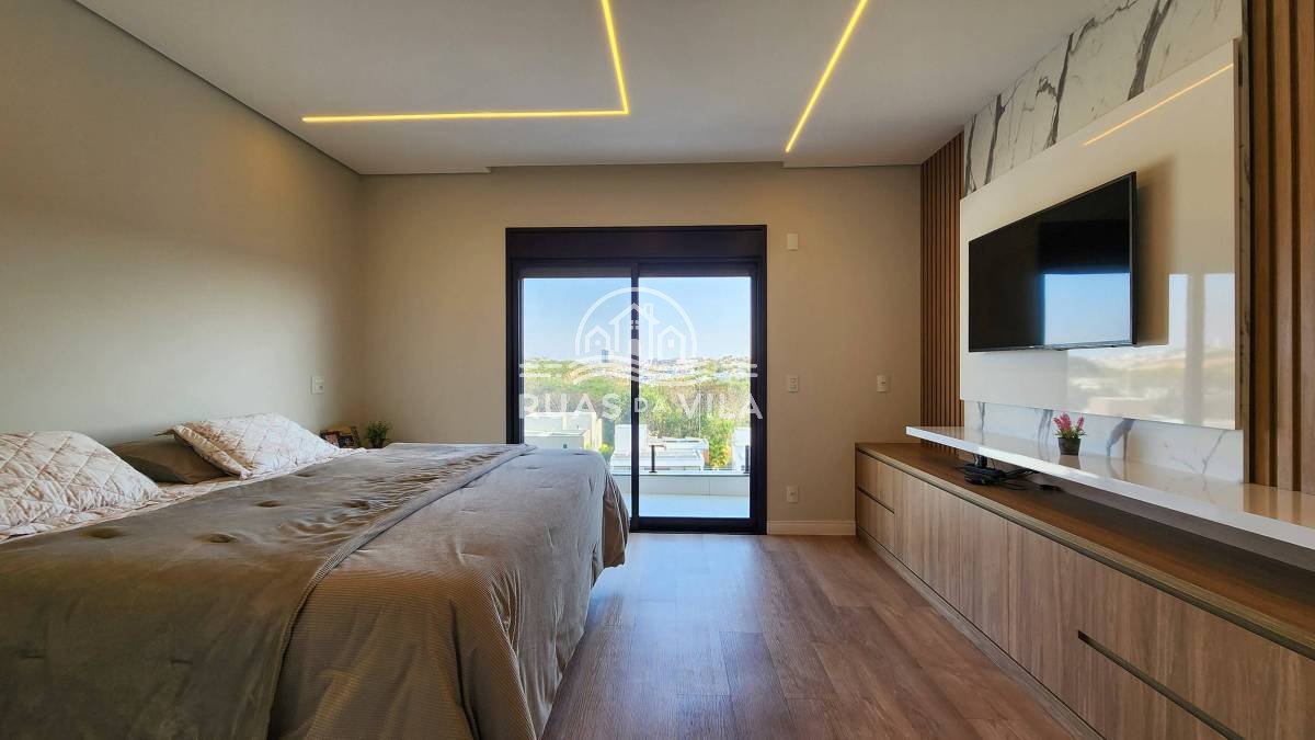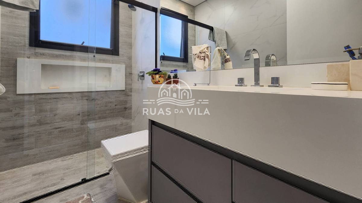 No térreo, hall de entrada, living para três ambientes, home theater, suíte térrea, lavabo e cozinha planejada com ilha central. No piso superior, quatro amplas suítes, sendo a master com closet e sala de banho.