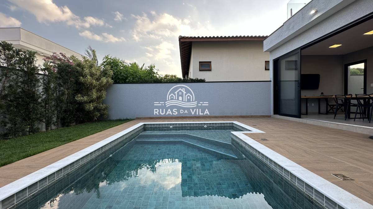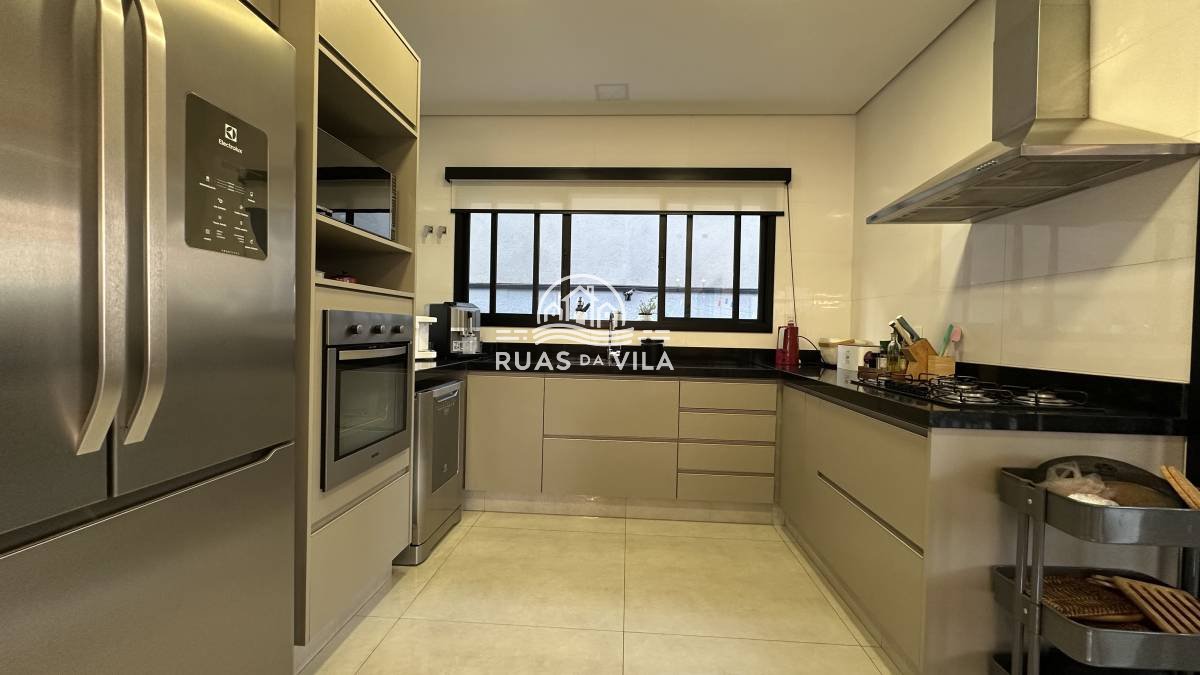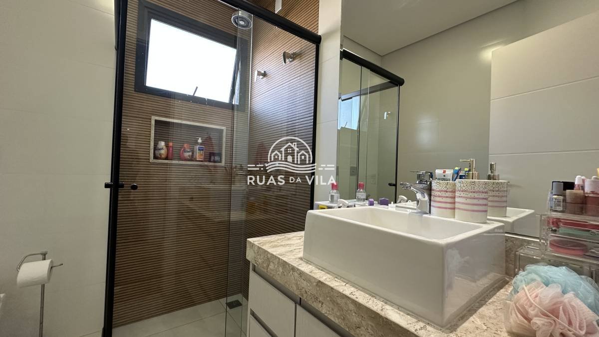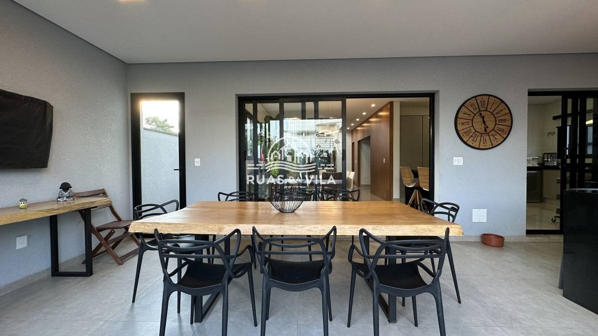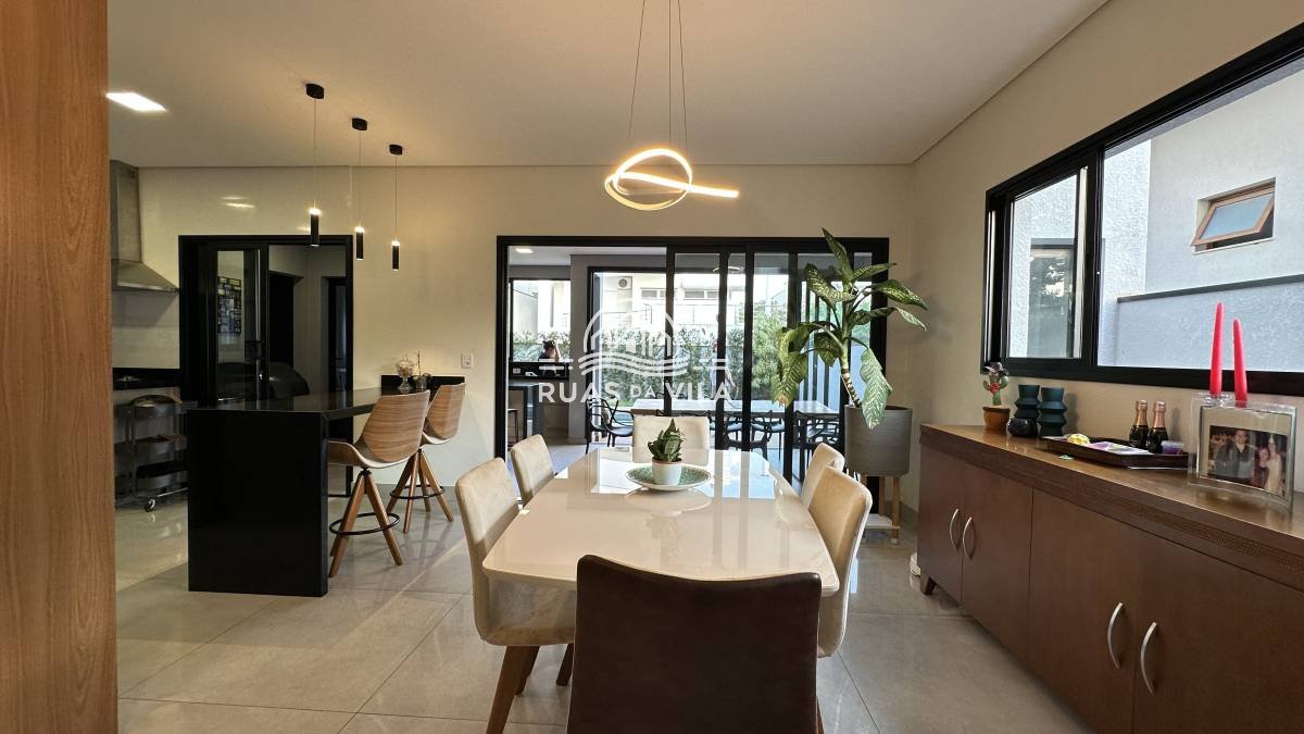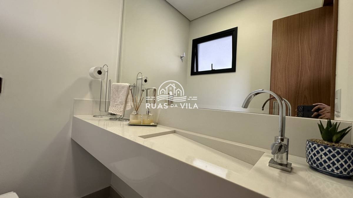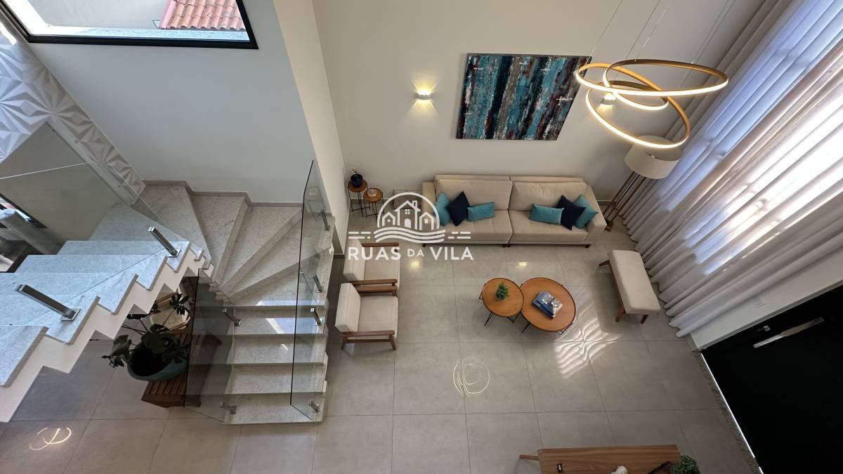 O living para dois ambientes, com pé direito duplo, oferece uma sensação de amplitude e luminosidade, complementado por um lavabo e uma suíte térrea. A casa ainda conta com um aconchegante home theater, cozinha planejada, despensa e área de serviço funcional.